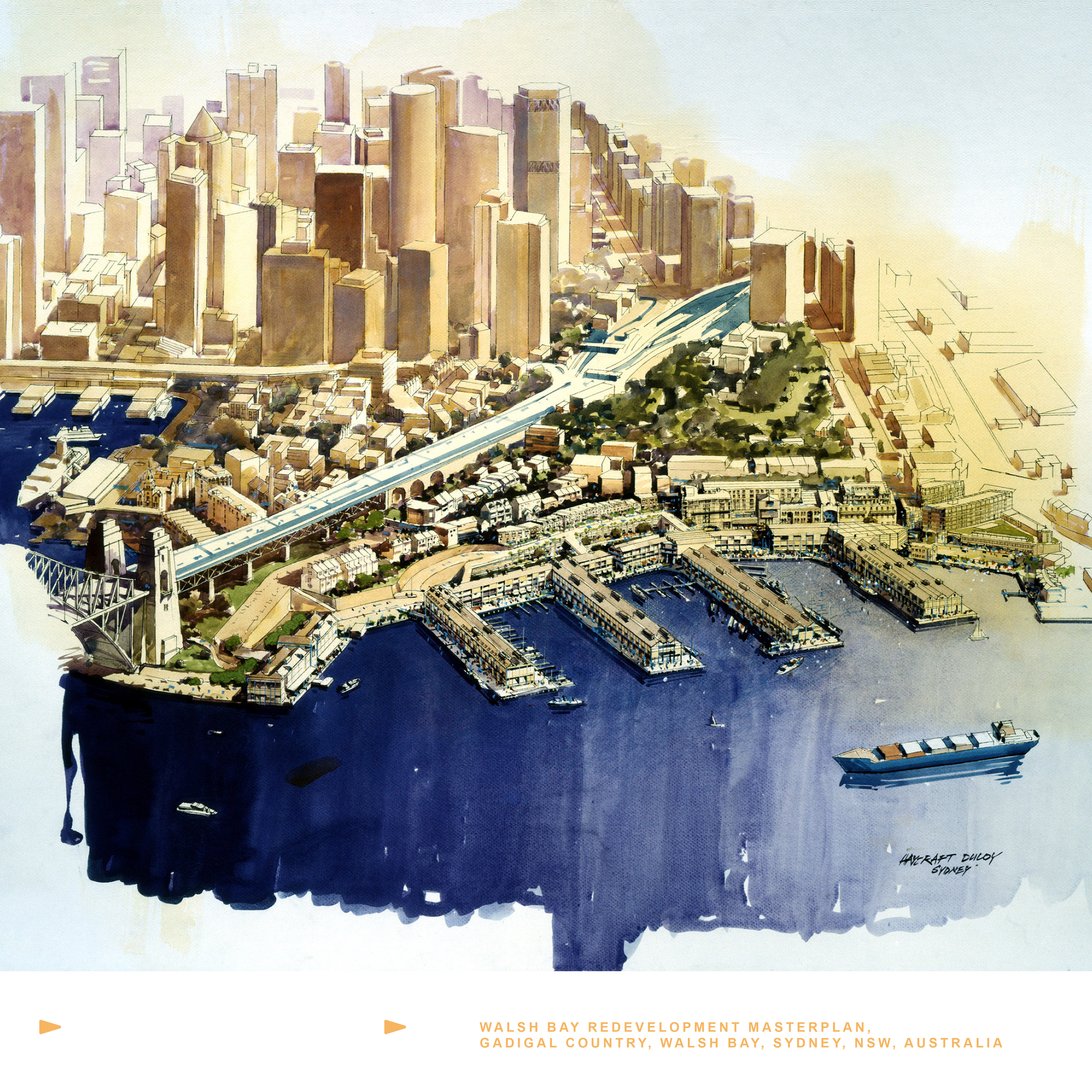 The redevelopment of Walsh Bay comprises the restoration and adaptation of its historic structures, including the construction of a new apartment block shaped to be like a wharf. Seeking to reinvigorated a historically important but disused part of Sydney Harbour, a masterplan was first developed to show how the likely conflict between a pedestrian focused public domain (with an activated waterfront) could operate alongside necessary vehicular and service access.
