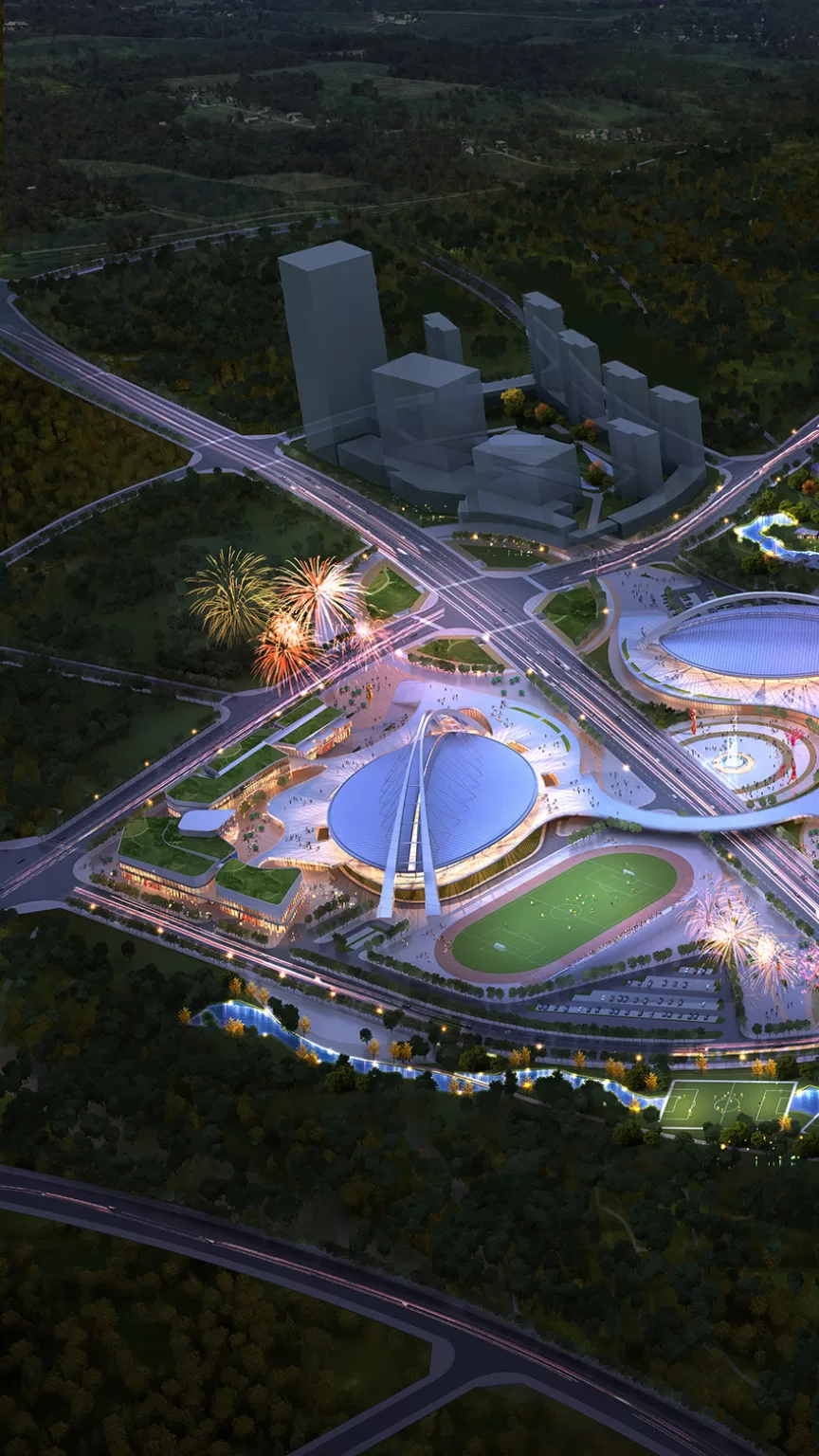 体育馆以金蚕的茧型建筑形态,简洁、饱满。以钢拱作为主要结构要素,功能与形式统一,彰显地标,呼应文脉。