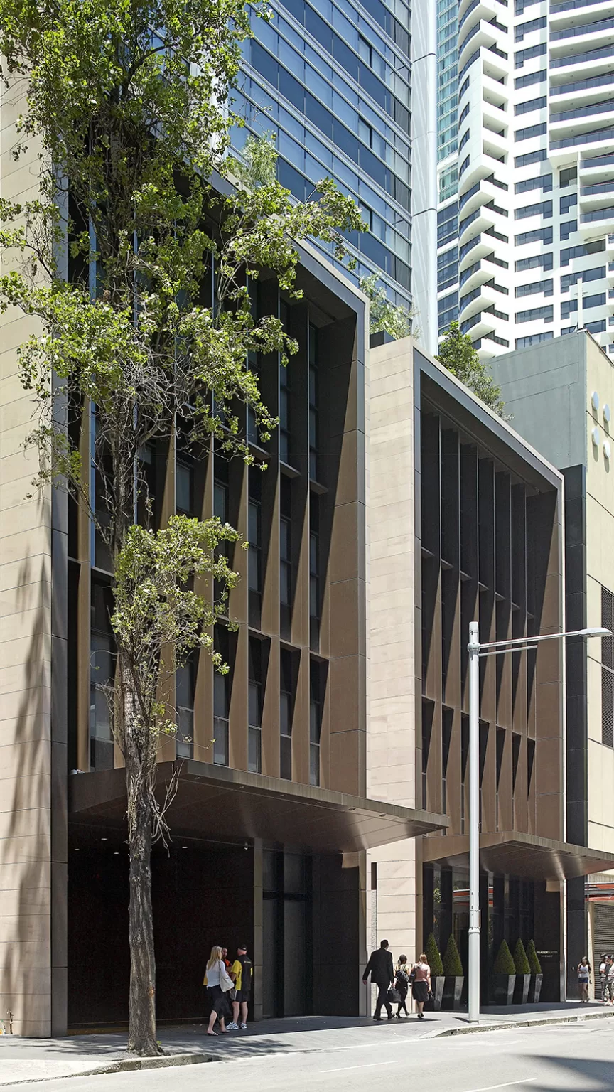 与街平行的砂岩裙房组成部分的设计尊重周围街景和文物建筑。在其上方的塔楼外层覆盖着金属和玻璃,通过其在底部一个凹陷的组成部分和裙房明显分开,仿佛浮在裙房上方,在向上伸展的过程中逐渐变得透明。