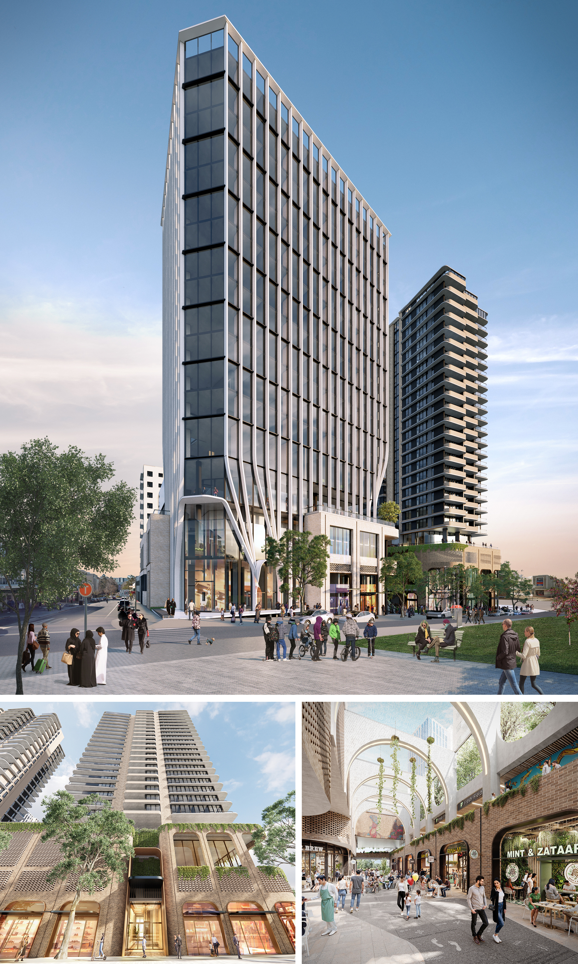 This mixed-use development includes 339 dwellings and 169 hotel rooms across three towers. The podium comprises ground floor retail activation, through-site links providing direct connections to and from the Bankstown railway (and future metro) station, Paul Keating Park, WSU Bankstown Campus and Bankstown Central Shopping Centre. The above ground podium includes a gym, function centre, childcare centre, medium-sized supermarket and medical uses.