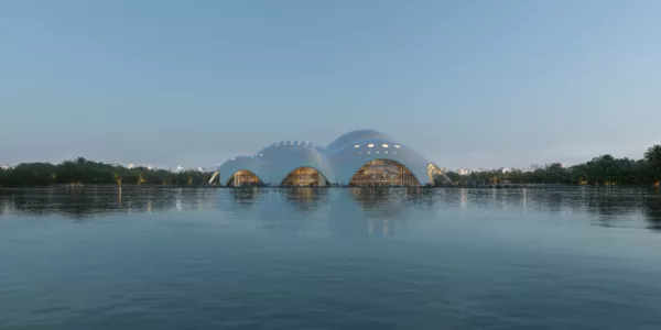 Conceived via mathematical models existing in nature and not just as a formal gesture, the music venue emerges from the lake’s waters with its mother-of-pearl gentle shapes. The geometry of the shell is not arbitrary but is related to the functions and the volumes enclosed whereby the primary shell is covered by an outer skin, deployed as a rain screen.