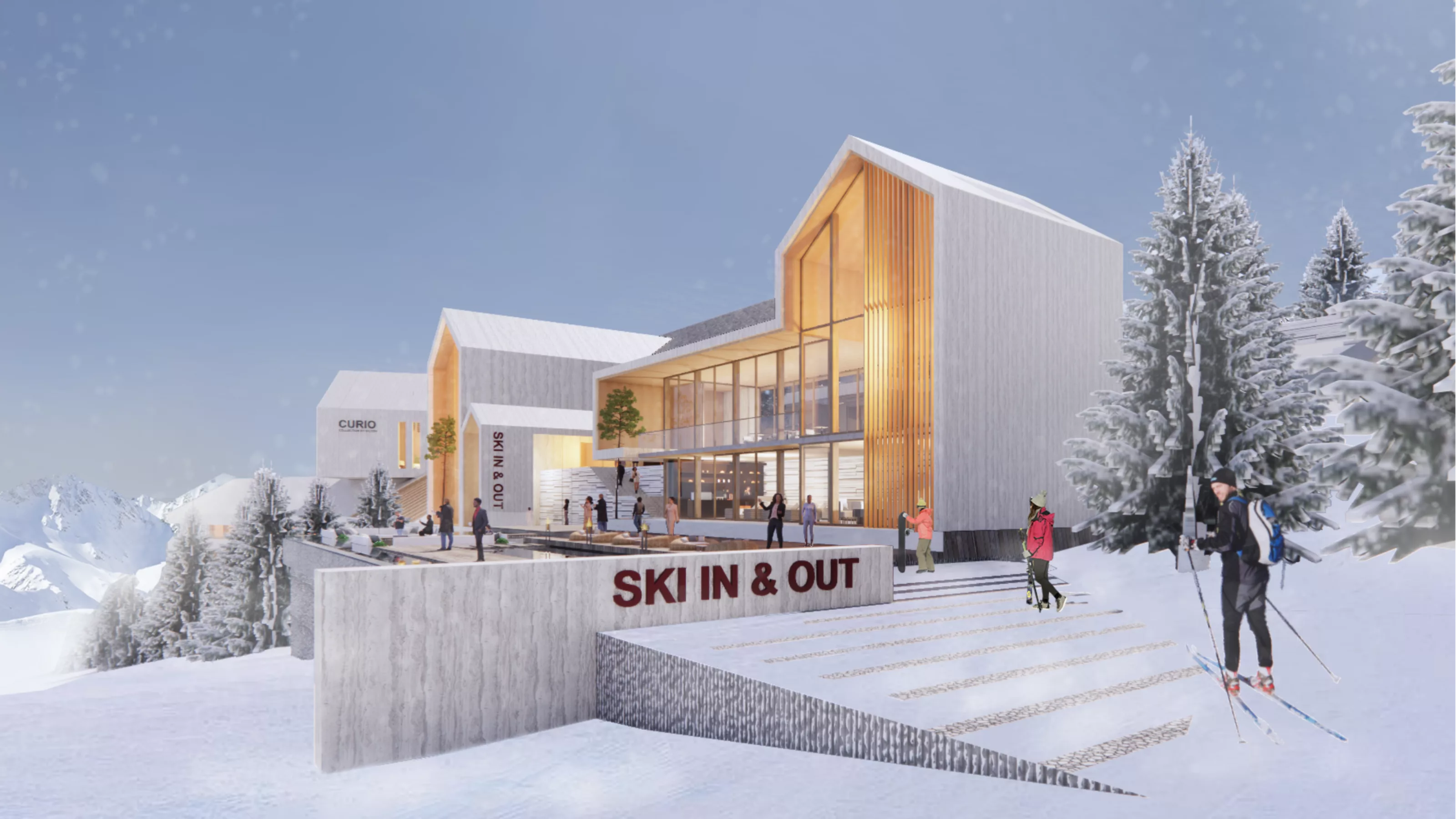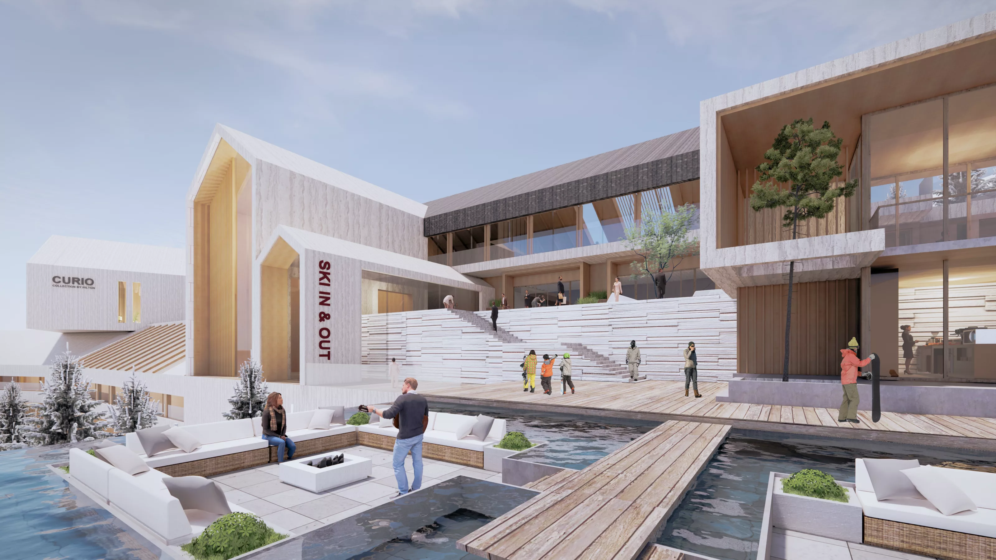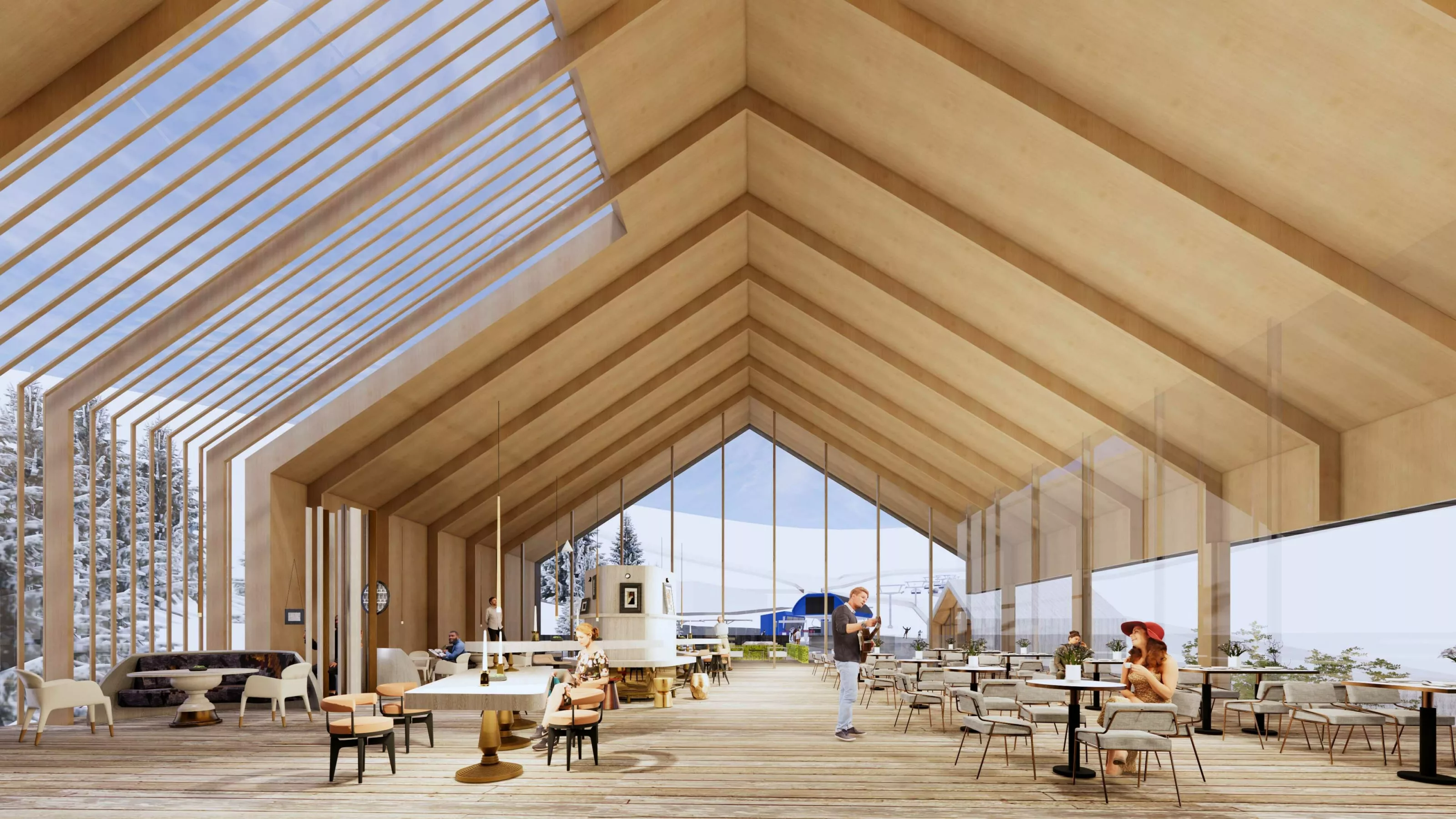 Inspired by the dual-pitched roof forms of the mining town vernacular dating back to the 1950s, the ski resort buildings combine industrial architecture with modern sustainable design solutions.