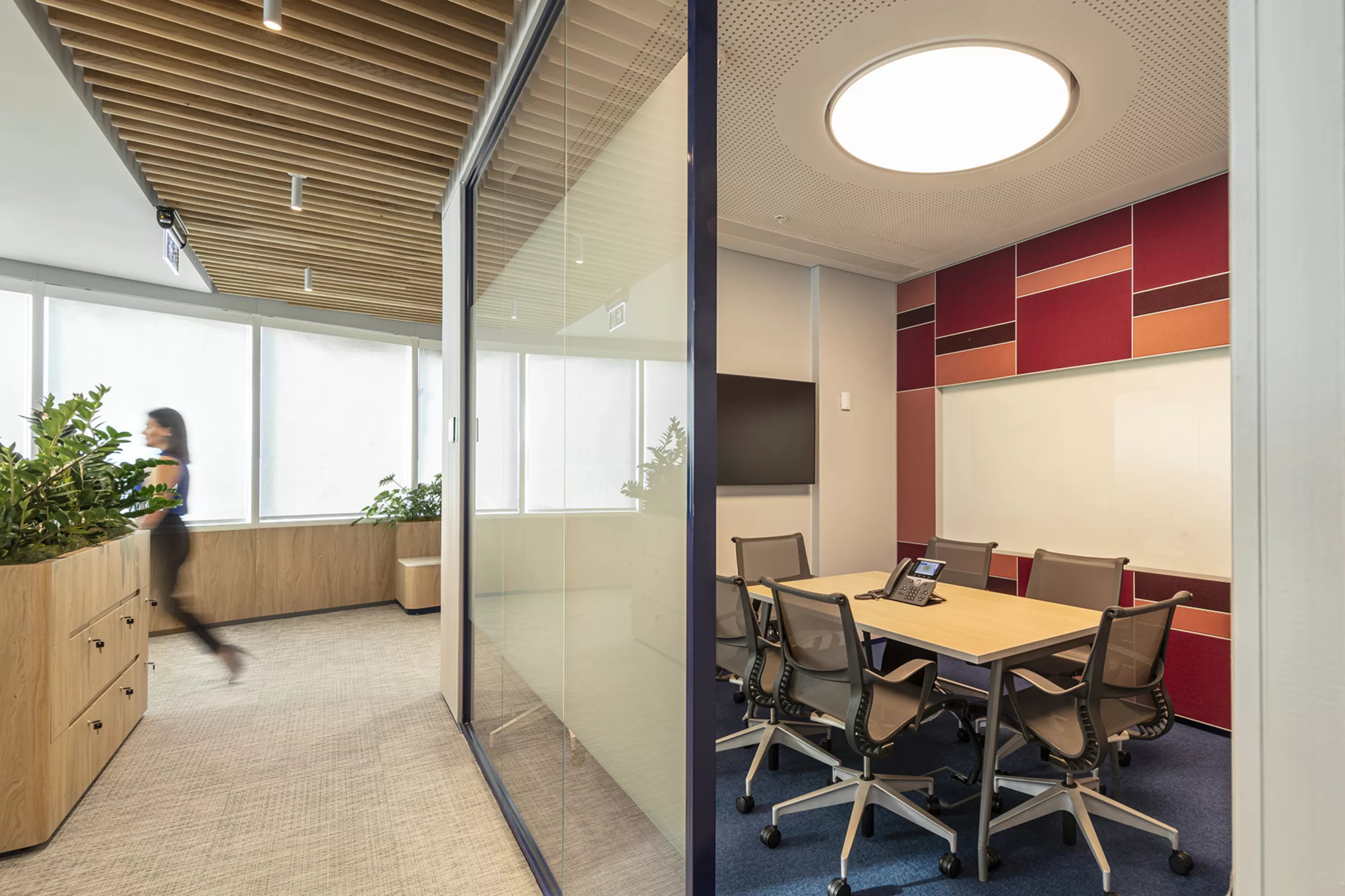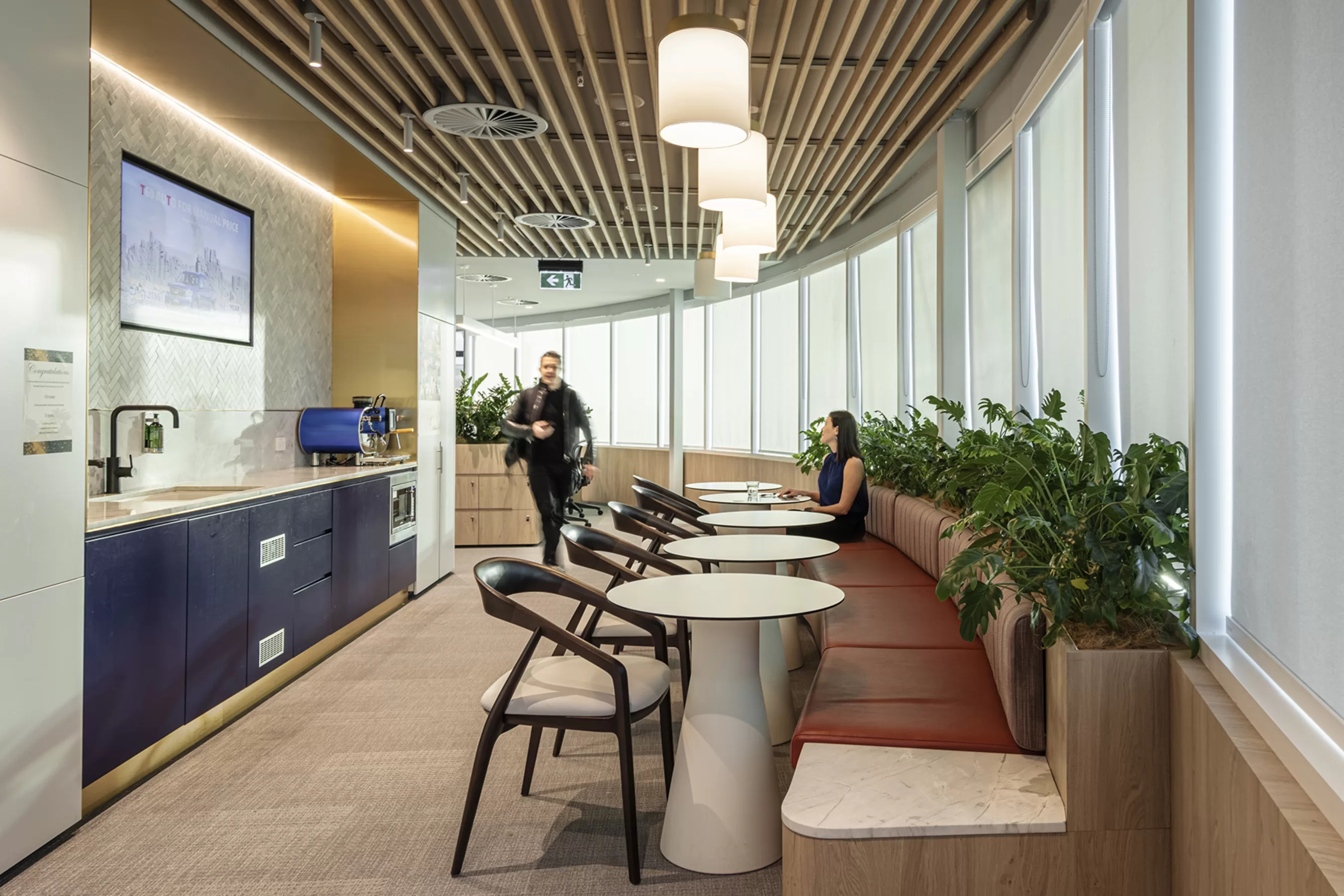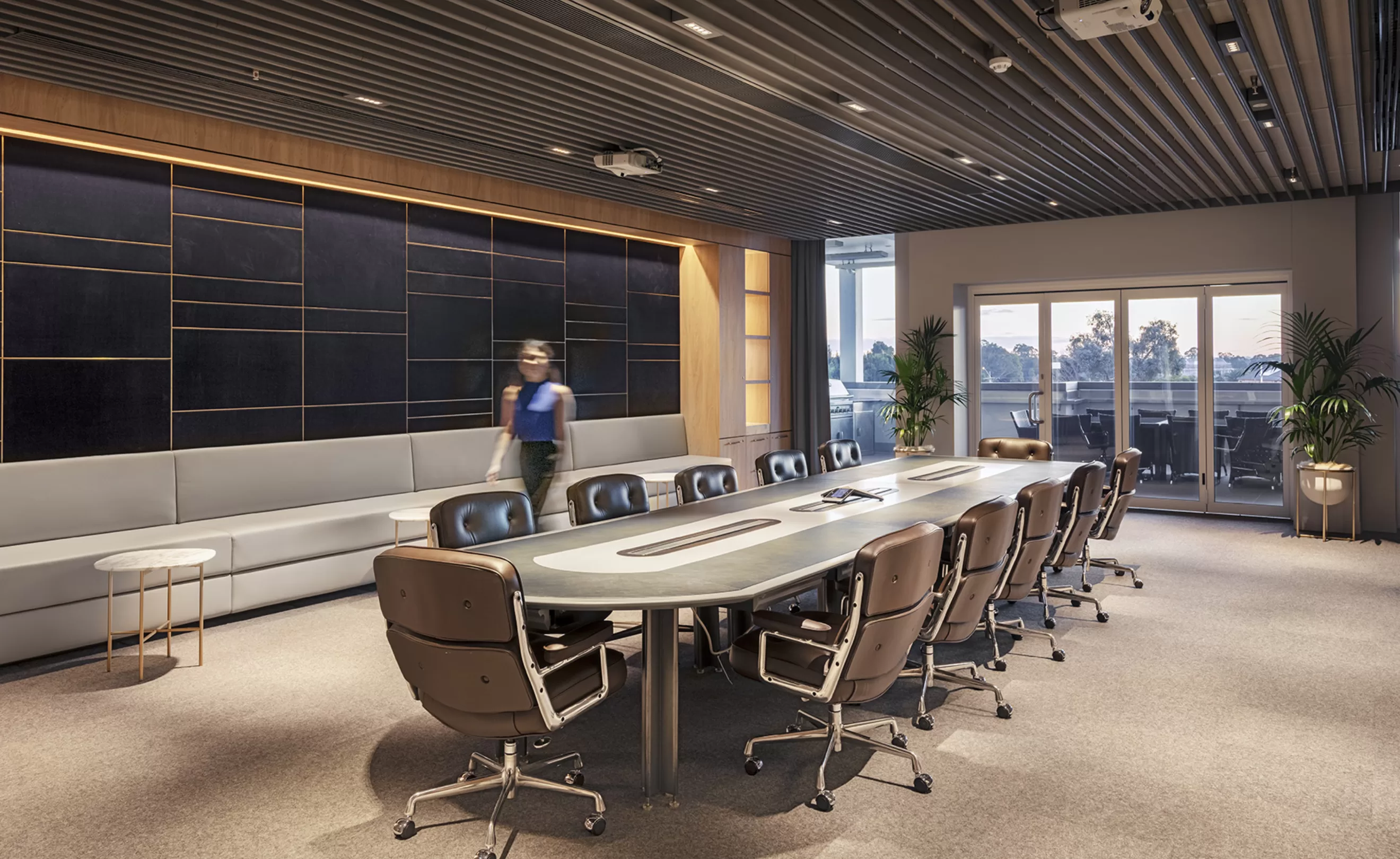 The open office and staff break-out area was positioned around the glazed curved perimeter zone to maximise the benefit of the of northern orientation and district outlook. Ergonomic furniture was a feature of the fit-out and included Herman Miller desks and chairs. All workstations were of adjustable height (sit to stand), supporting the agile, flexible working environment. The main board room and series of more intimate meeting areas and private retreat spaces provided the diversity of spatial settings to meet the team’s needs.
