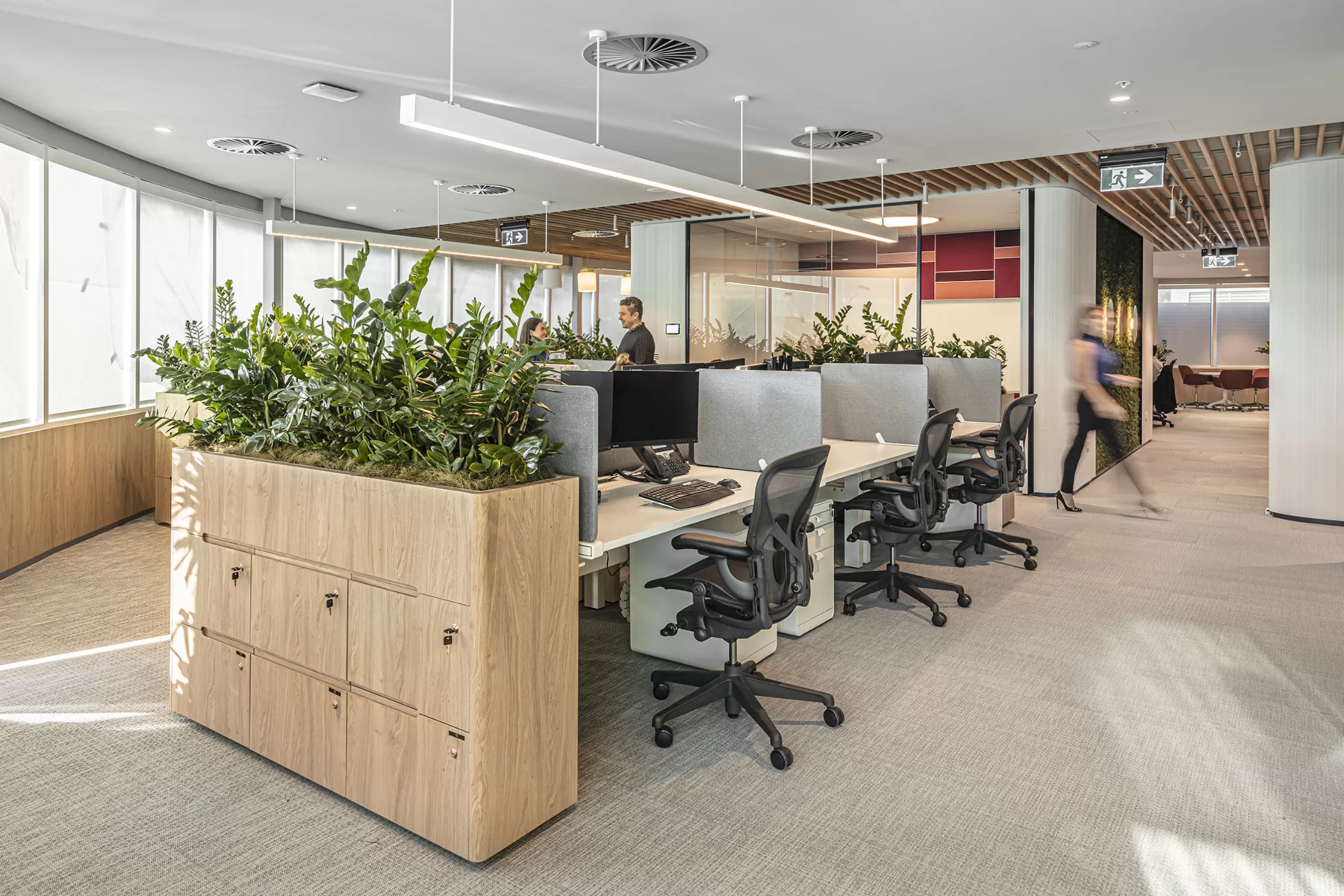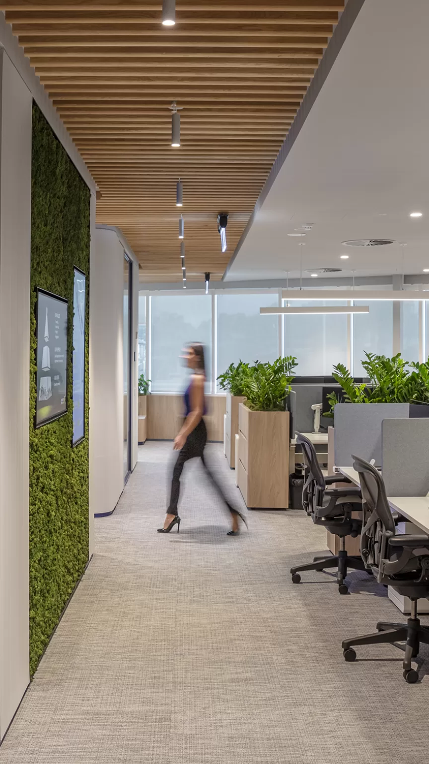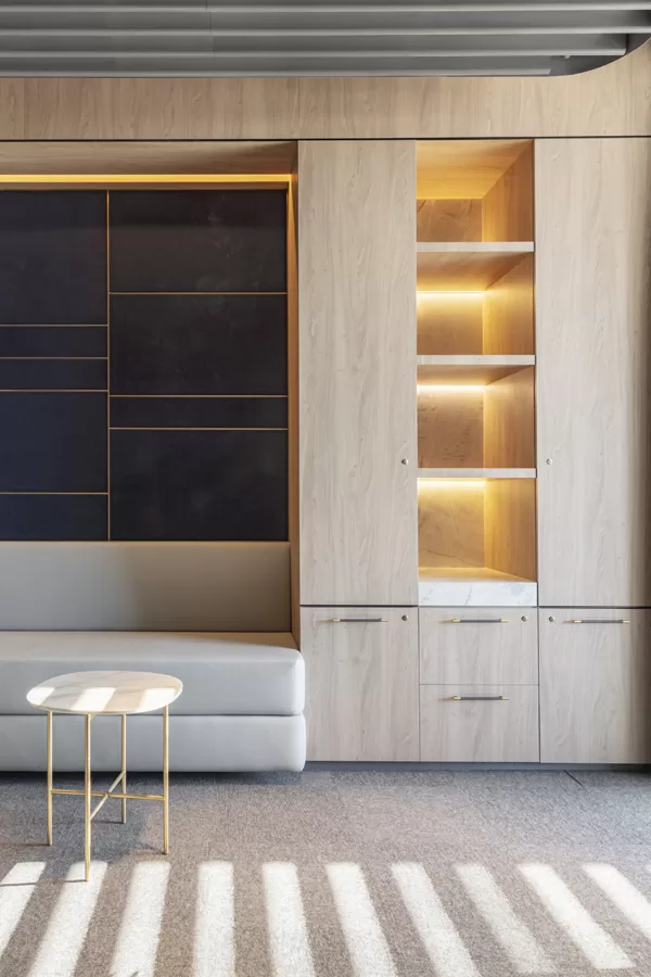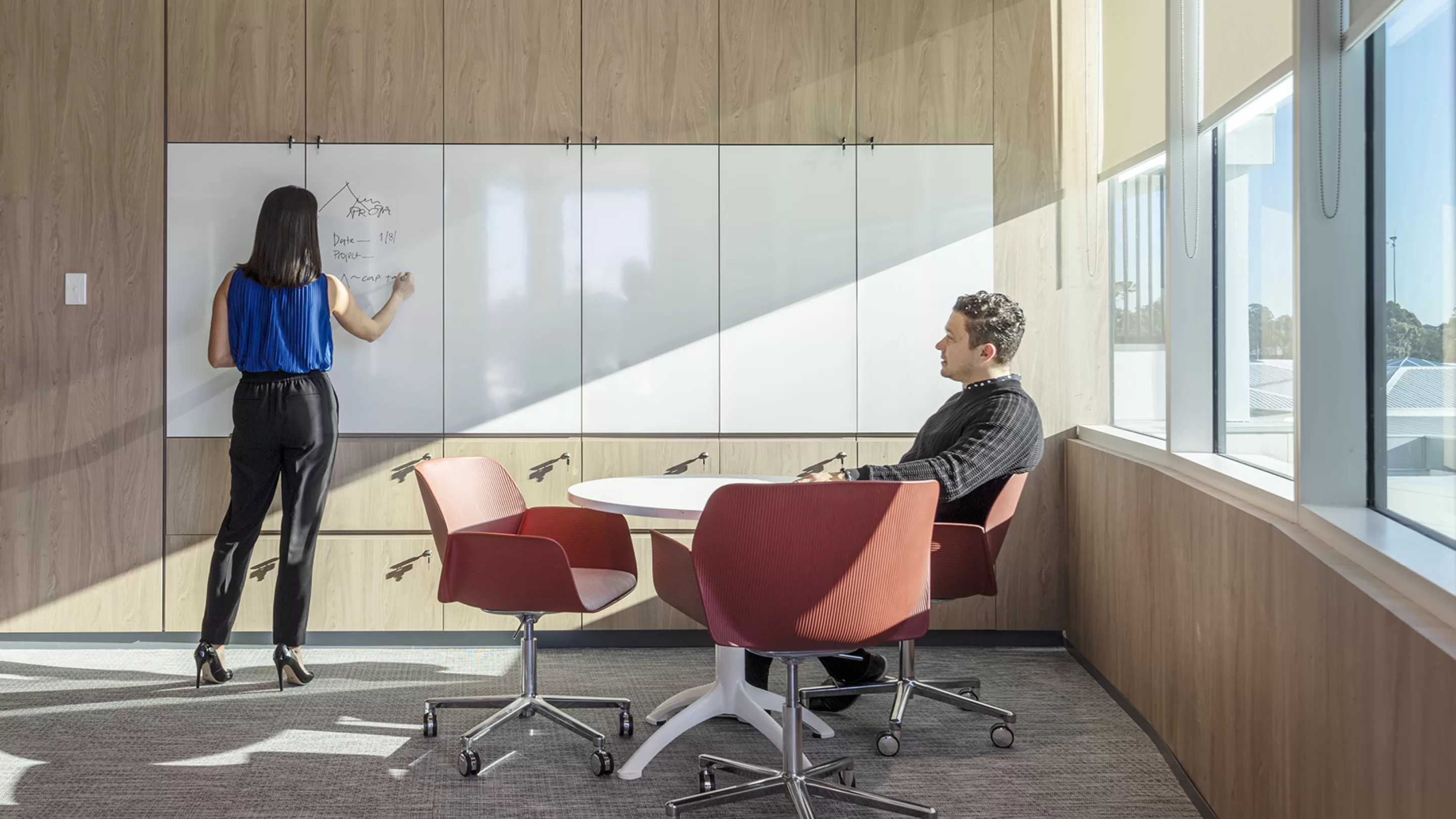 The open office and staff break-out area was positioned around the glazed curved perimeter zone to maximise the benefit of the of northern orientation and district outlook. Ergonomic furniture was a feature of the fit-out and included Herman Miller desks and chairs. All workstations were of adjustable height (sit to stand), supporting the agile, flexible working environment. The main board room and series of more intimate meeting areas and private retreat spaces provided the diversity of spatial settings to meet the team’s needs.