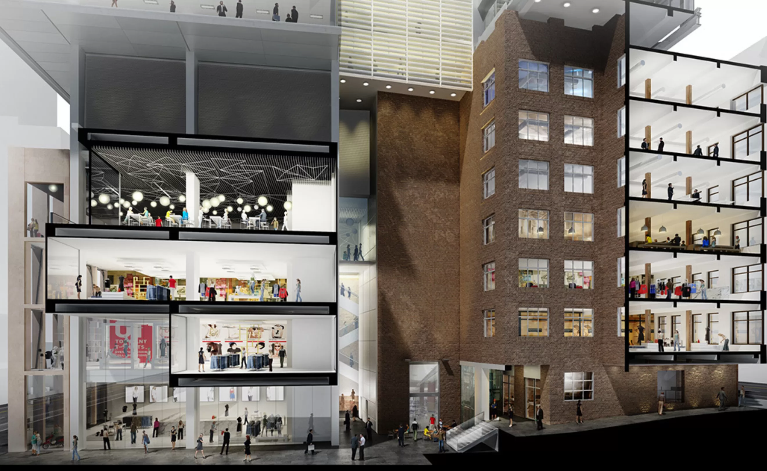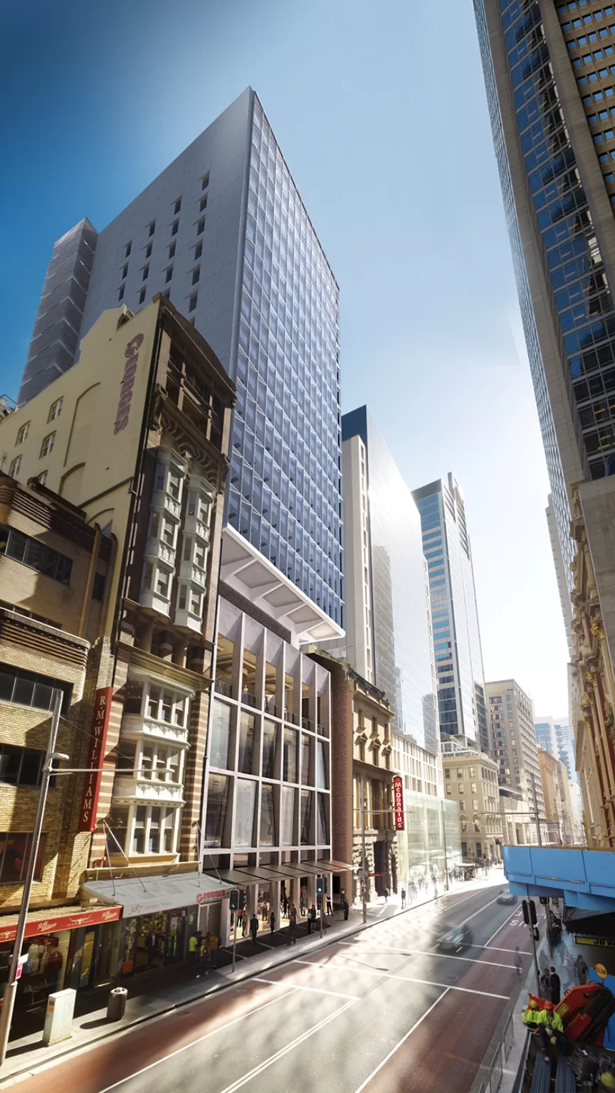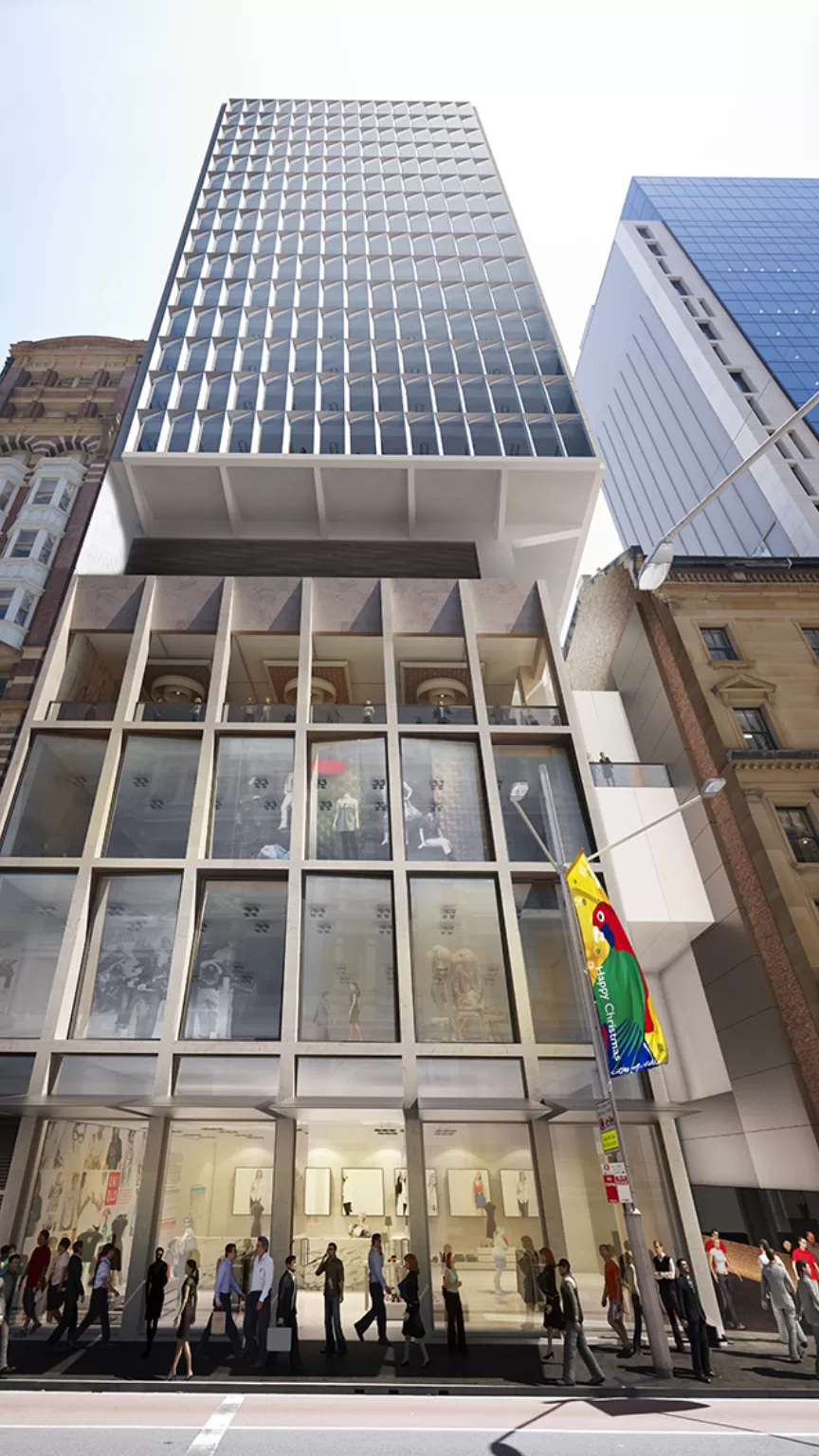 项目位于悉尼中央商务区的乔治大街,与斯特兰德商场和市中心购物区相对。建筑的裙房共四层,为4,000平方米的零售区,主要由两座遗产建筑组成。该地块通向约克大街的道路已被保留为悉尼最后一条马车道。而13层高的A级办公空间则在零售底商和文物建筑之上向外悬挑。