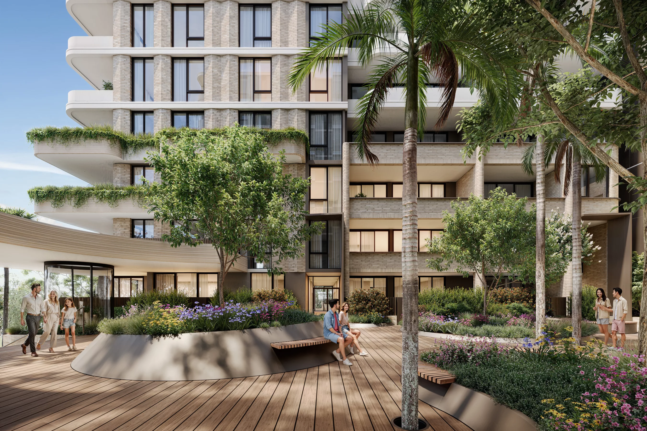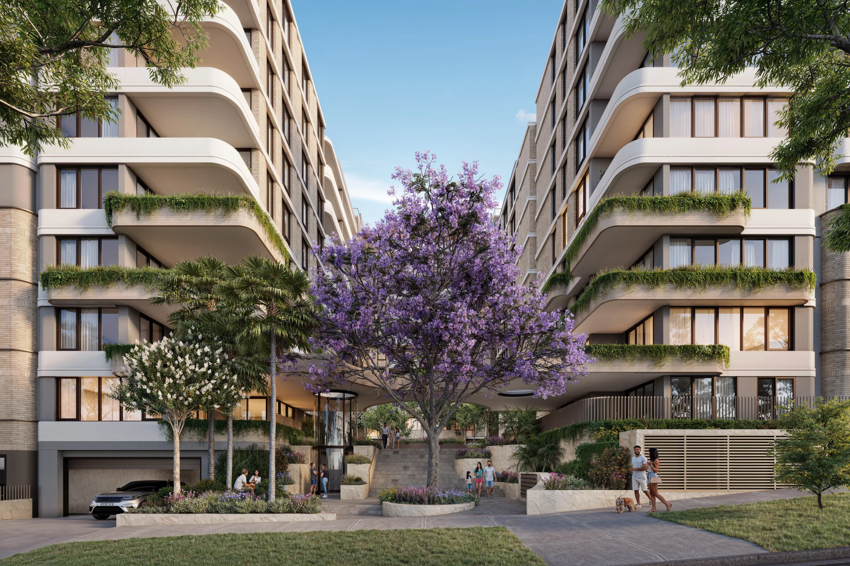 This layered façade composition integrates solidity, variation, and biophilic qualities. Rounded balcony edges, deep reveals, and integrated planters create shadow play and introduce greenery, ensuring the building presents as elegant, softer-edged, and responsive to its leafy setting.