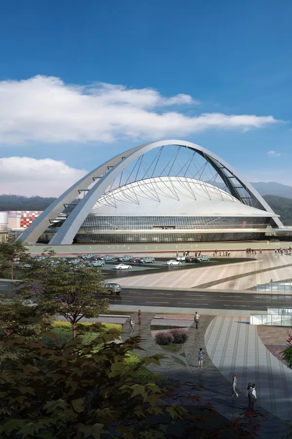 体育馆以金蚕的茧型建筑形态,简洁、饱满。以钢拱作为主要结构要素,功能与形式统一,彰显地标,呼应文脉。