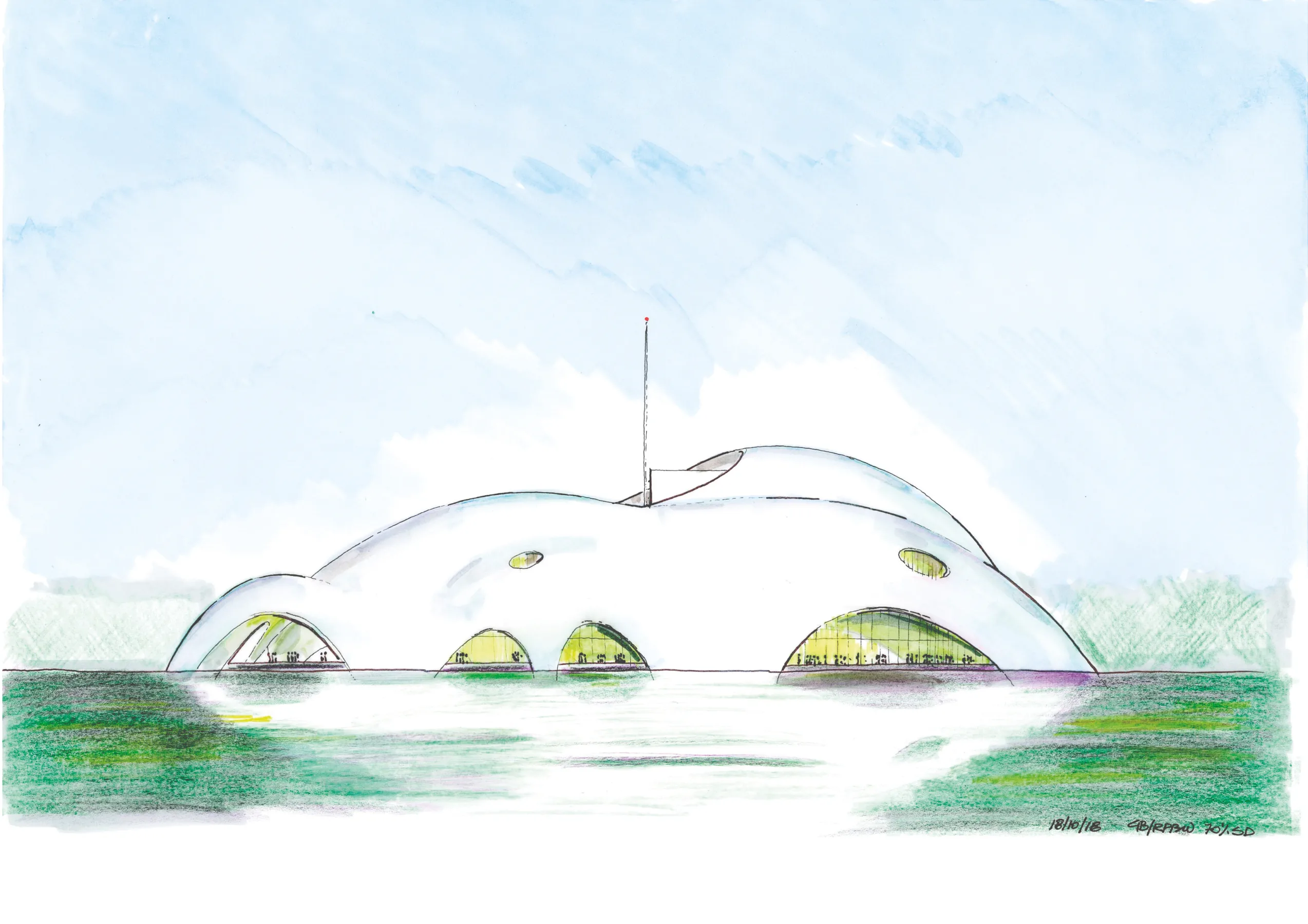 Conceived via mathematical models existing in nature and not just as a formal gesture, the music venue emerges from the lake’s waters with its mother-of-pearl gentle shapes. The geometry of the shell is not arbitrary but is related to the functions and the volumes enclosed whereby the primary shell is covered by an outer skin, deployed as a rain screen.