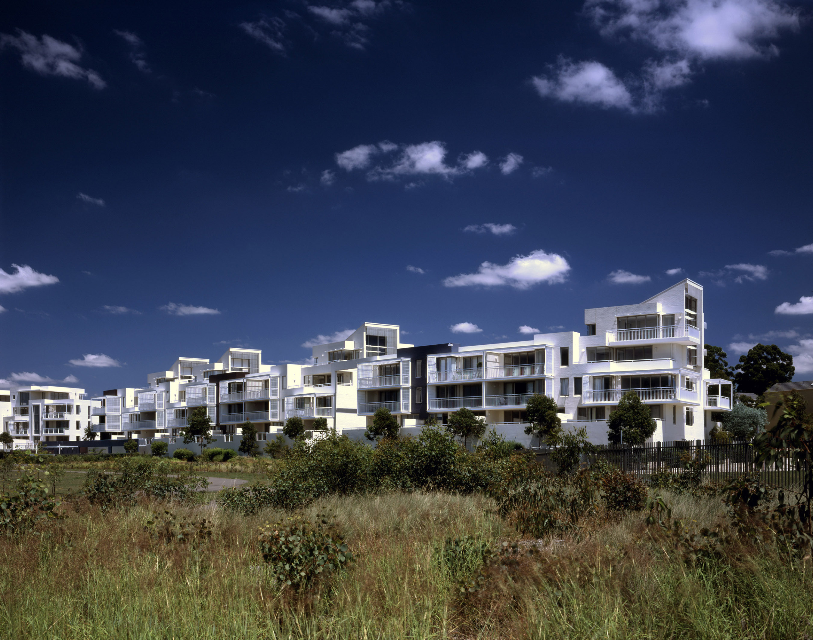 Marked by their articulate roofline, the buildings occupied a prominent position in the continuous ribbon of apartment buildings on the village's edge near to the major sporting facilities. Prioritising sustainability, the design also incorporated passive design strategies such as cross ventilation; minimal south facing glazing; large, shaded north facing areas; as an extension of the living spaces; and vertical sun shading devices..
