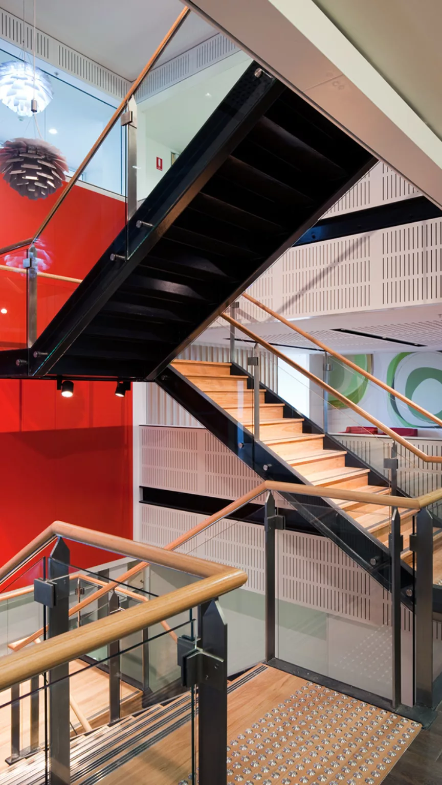 Underfloor air conditioning system minimised the volume of air conditioned and energy footprint. Underfloor cable reticulation allowed for flexibility in office layout. Other sustainable initiatives and features included low-VOC and low-formaldehyde adhesives, fixtures and sealants, energy-efficient, sub-metered lighting design, superior acoustic treatment to minimise internal noise and more.