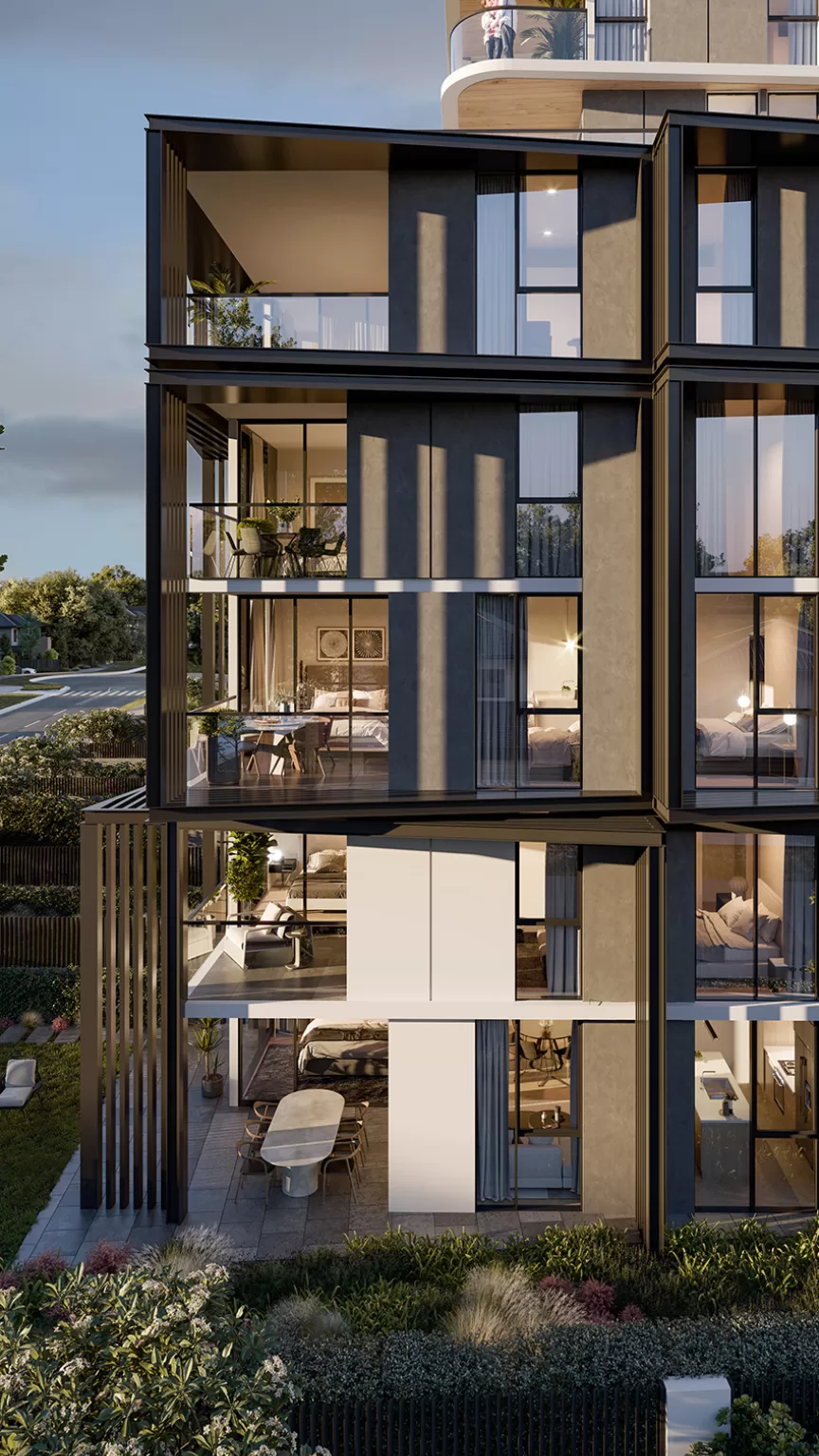 The rooftop offers extensive community gardens, unique spaces and amenities such as a resort-style infinity pool, gymnasium, spacious BBQ areas, a tranquil internal Zen garden area and expansive views across natural landscapes.