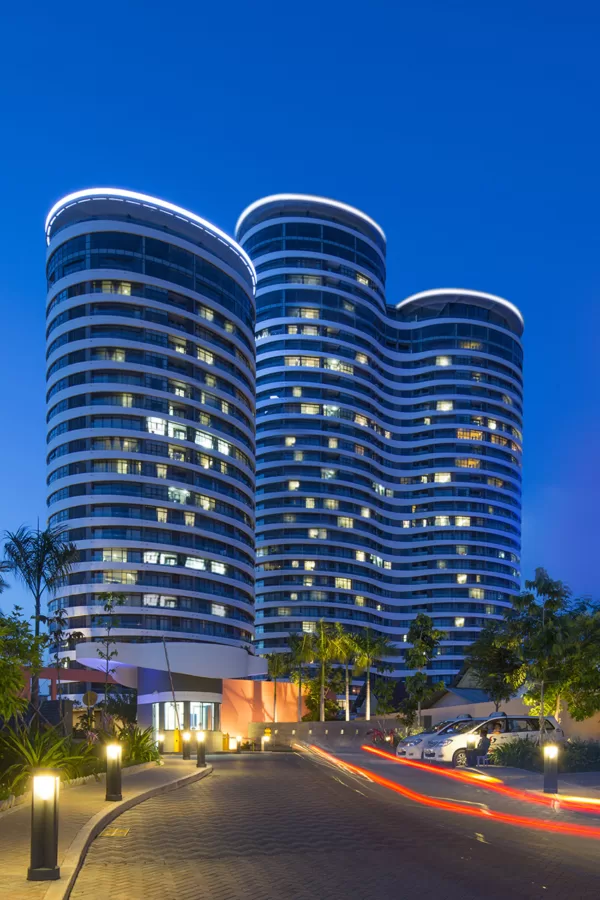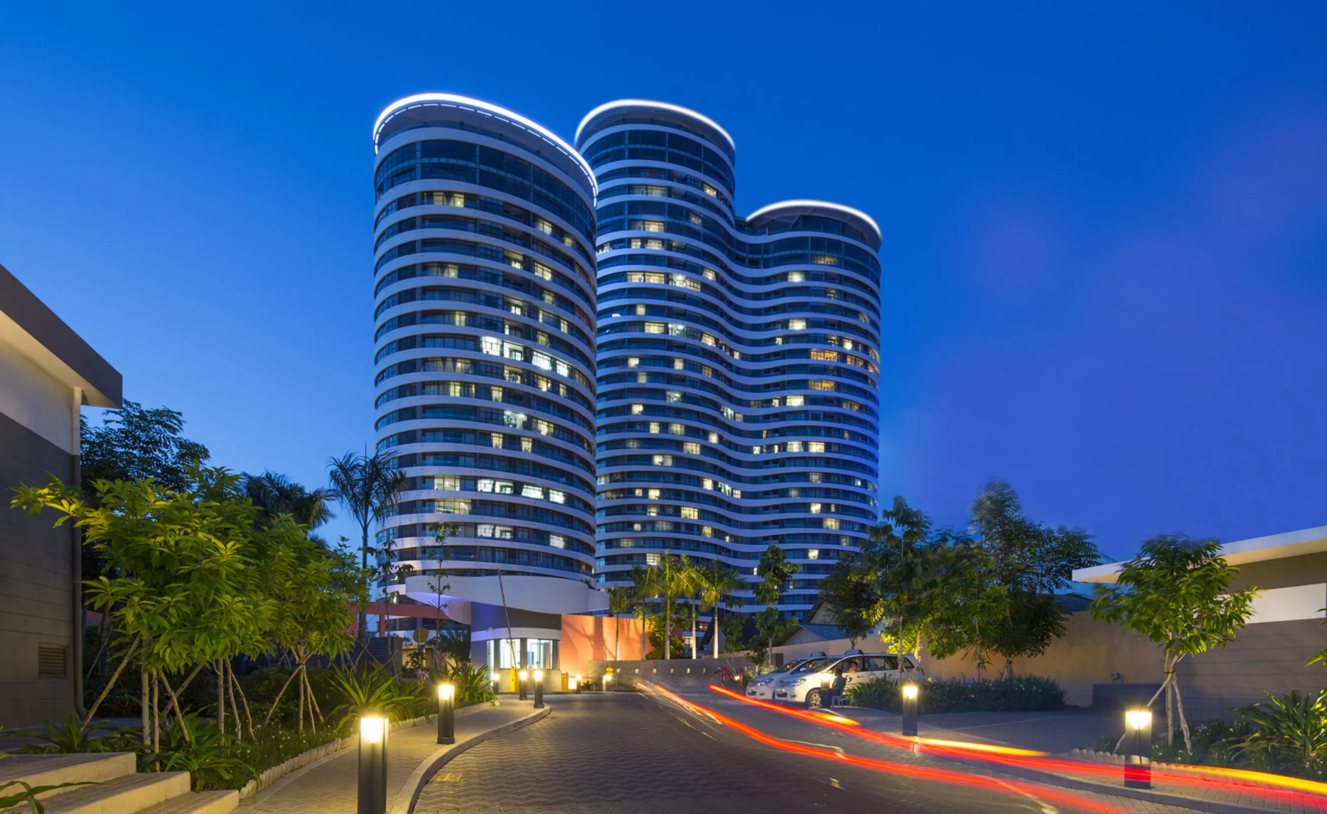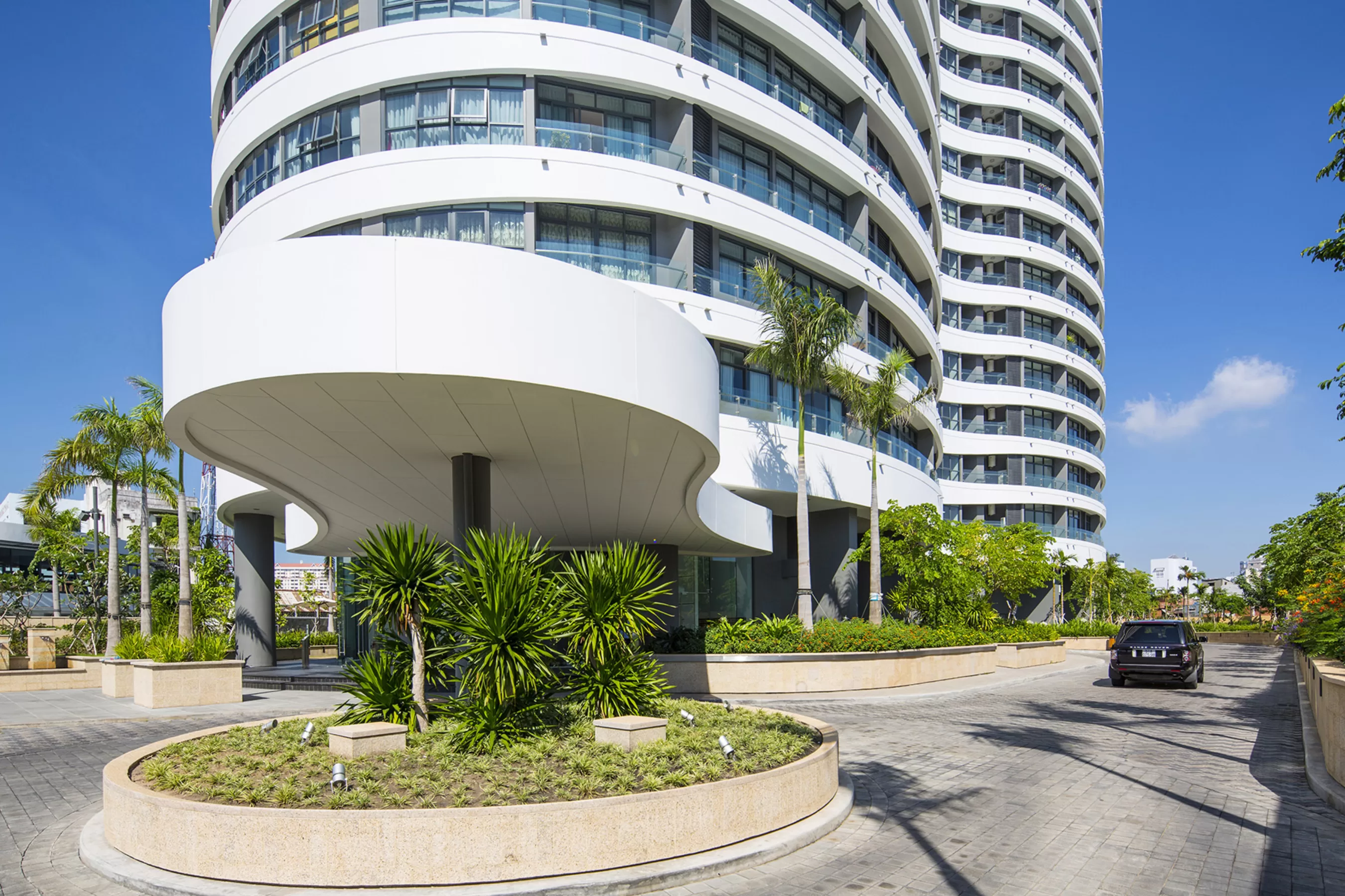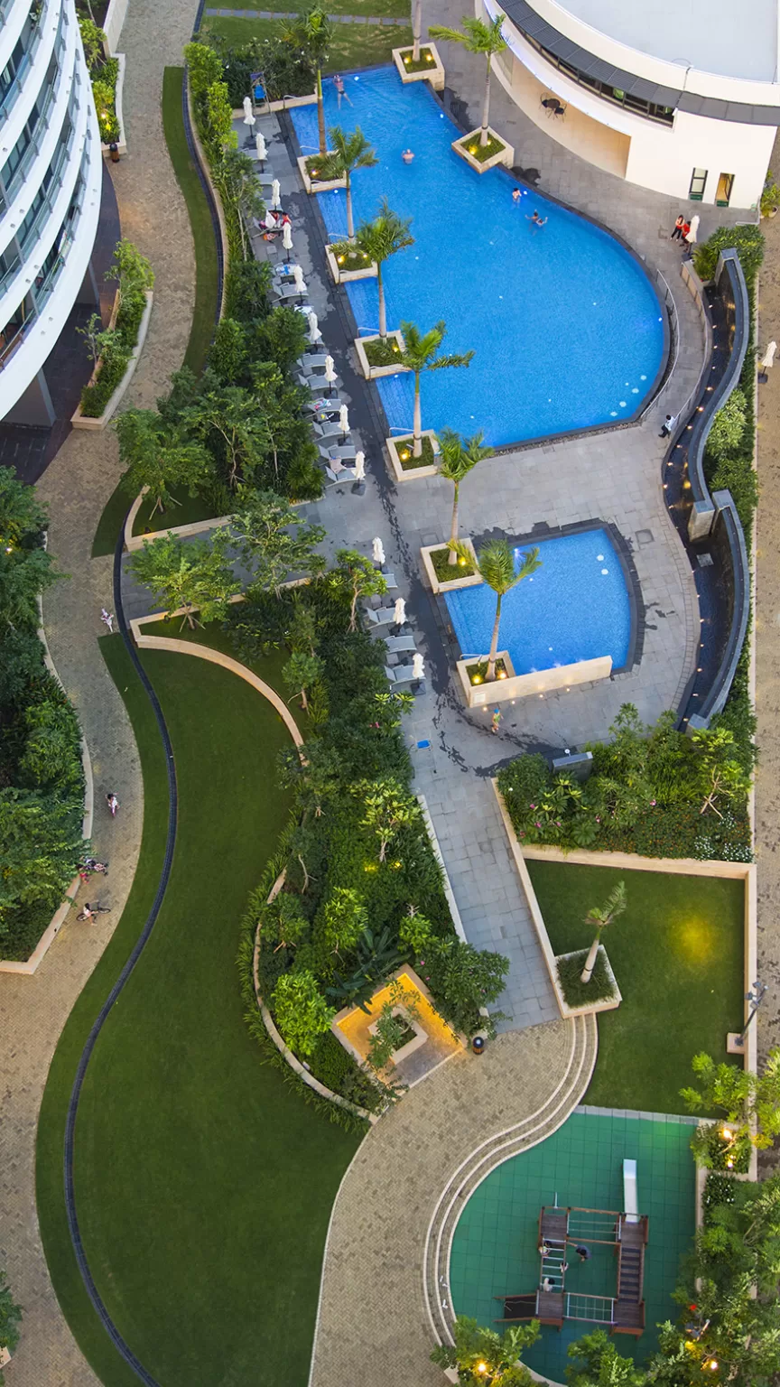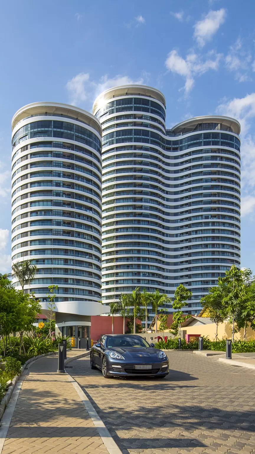 The 127,500 square meter complex provided 927 high-end apartments with access to various tenant amenities set in lush parkland. The three tallest towers were approximately 110m high offering extensive views out from curving balconies. Facades were accentuated by an undulating façade which provided both privacy and solar protection.