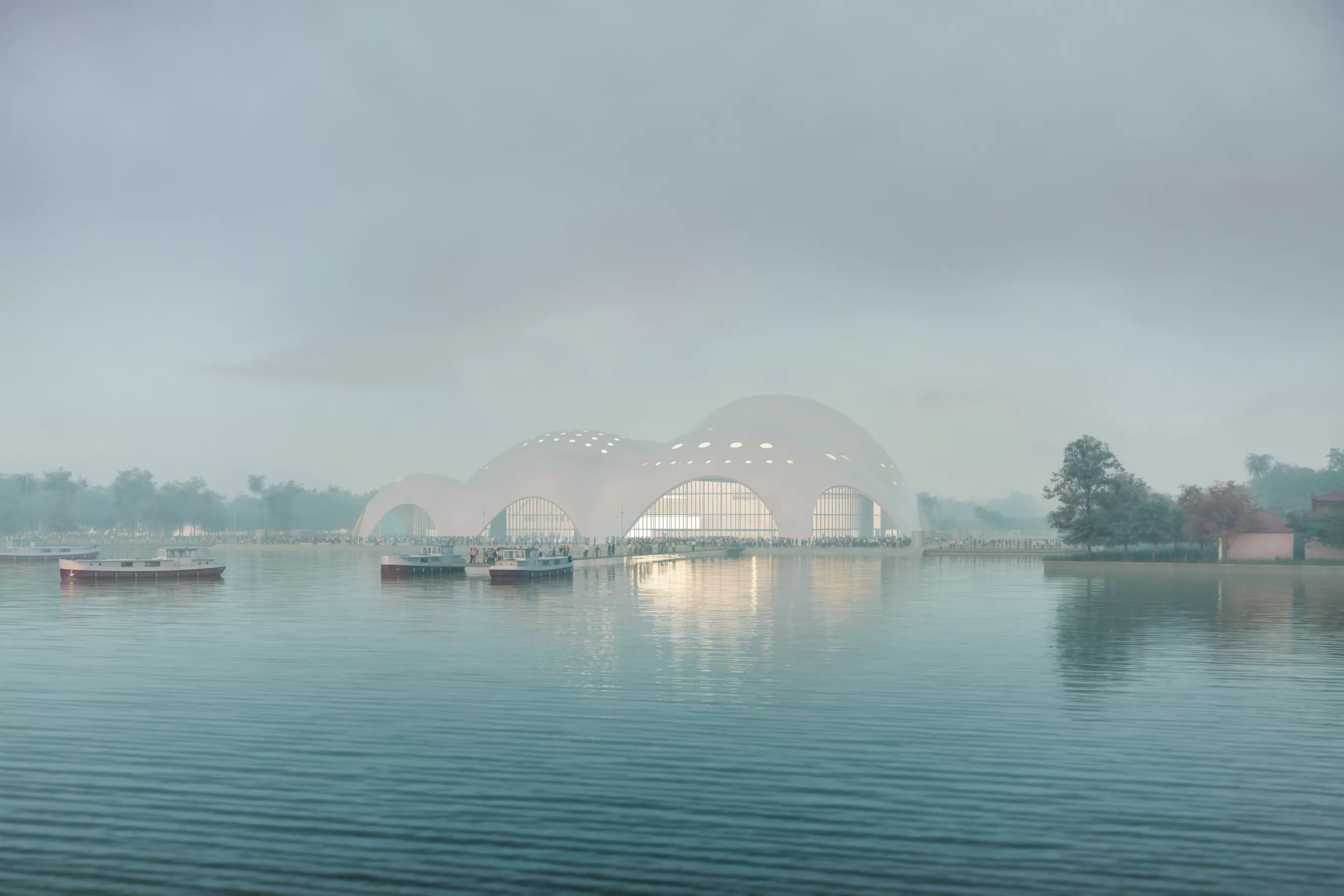 Conceived via mathematical models existing in nature and not just as a formal gesture, the music venue emerges from the lake’s waters with its mother-of-pearl gentle shapes. The geometry of the shell is not arbitrary but is related to the functions and the volumes enclosed whereby the primary shell is covered by an outer skin, deployed as a rain screen.