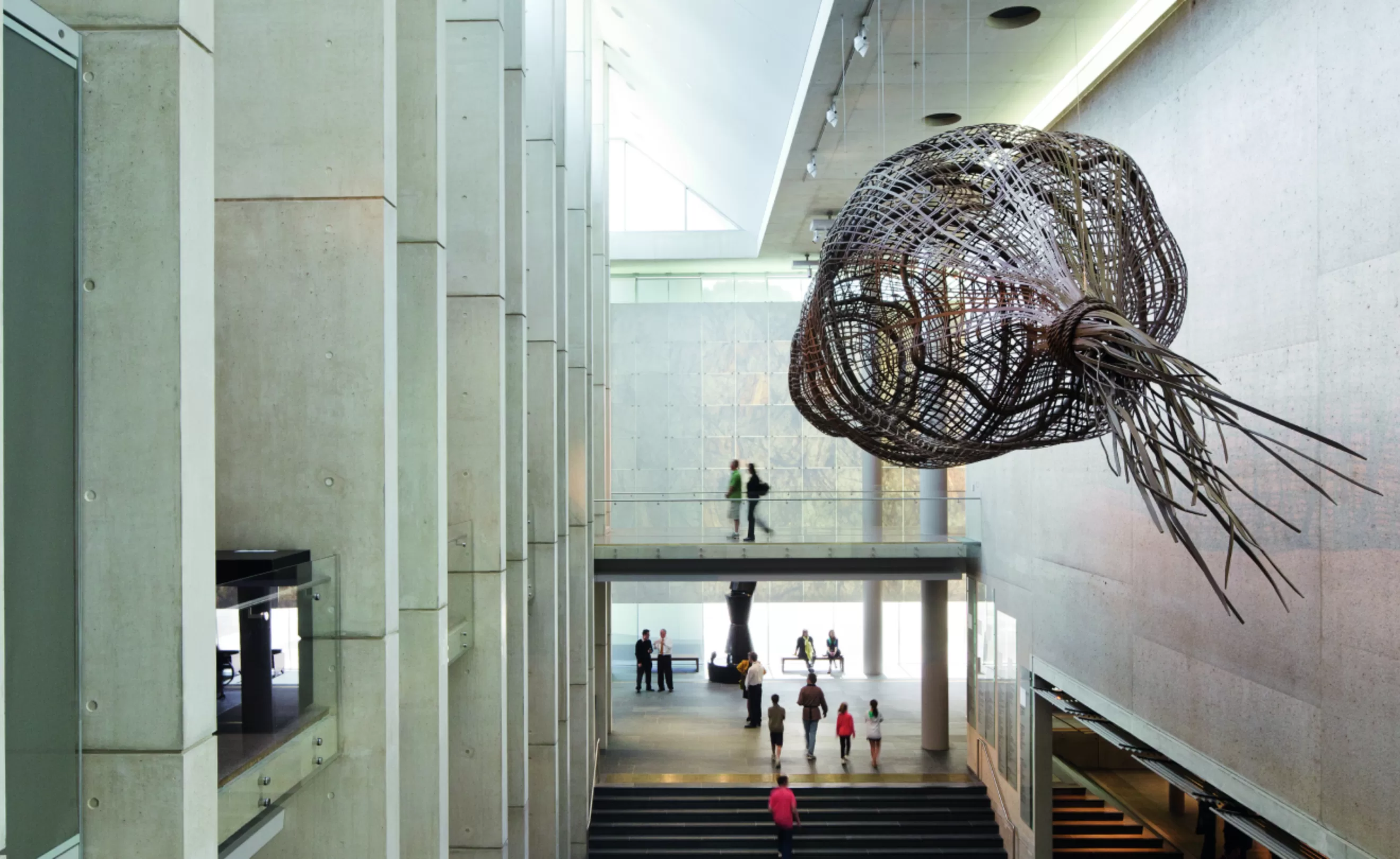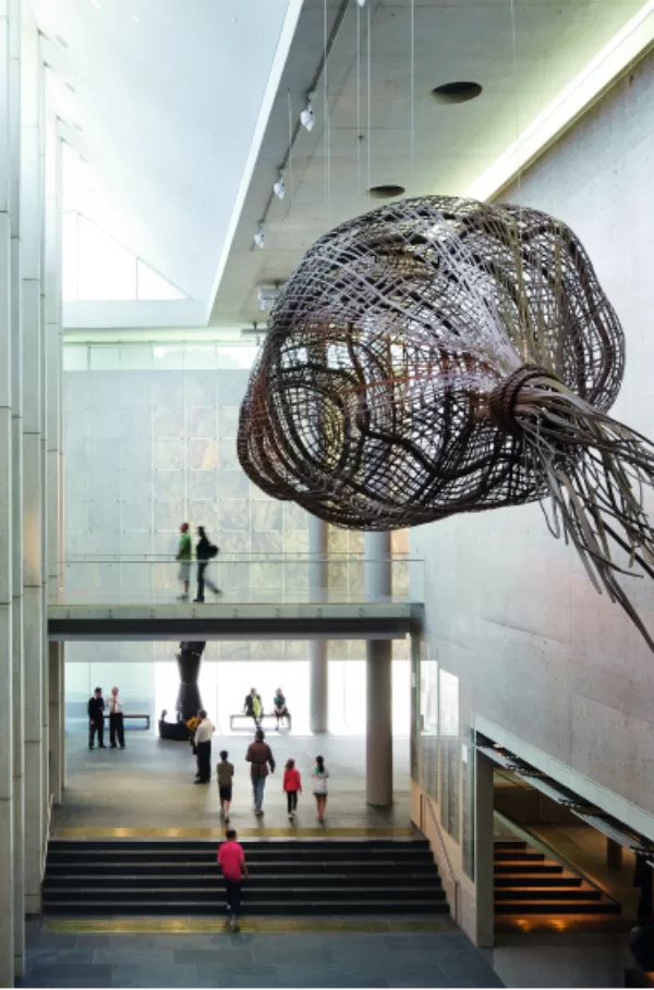 The larger galleries were suffused with natural daylight, which was mediated by a skilfully manipulated cross-section that evened the light distribution and reconciled subtle variations in the height and scale of each room calibrated to the works therein. Supplementary spotlighting illuminated the works. The legible composition of rooms allowed for a thematic arrangement of the astonishing works in the Aboriginal and Torres Strait Islander collection.