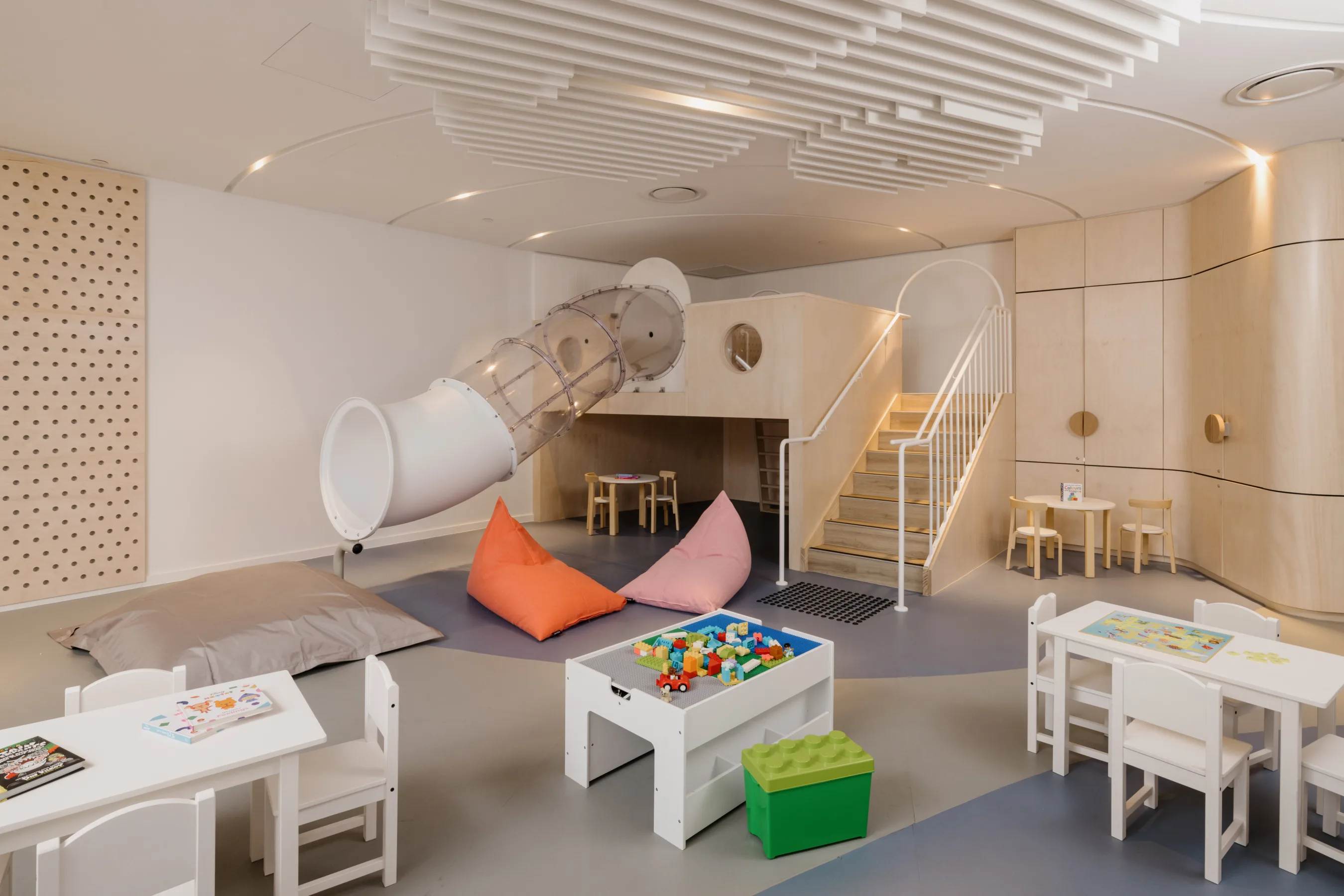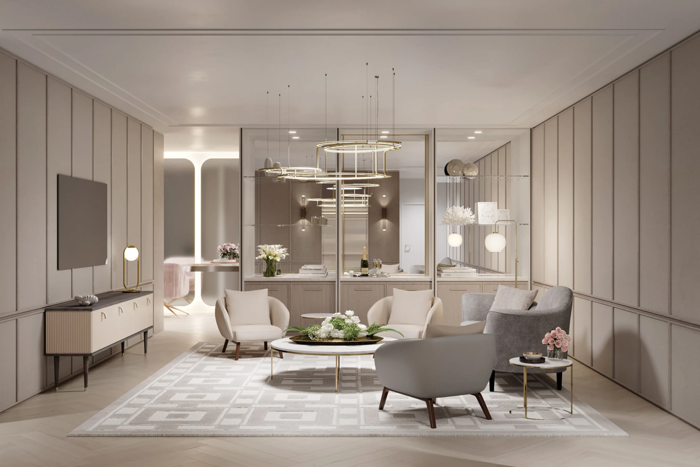 The project was a collaboration between Studioaria, PTW and DBI Design. Studioaria designed the Lobby, Palm Court, Lobby Bar, Tang Court, Akoya, 26 & Sunny, the Ballroom & Function spaces, Spa, Indoor-pool, Presidential & Chairmans Suites. PTW designed the Guestrooms, Suites, Gym, Kids-play, Outdoor bar, Bridal-Suite, Residential lobby and offices. PTW: tender documentation; DBI: construction documentation and site implementation.